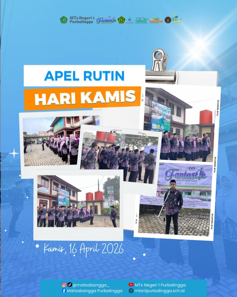 Purbalingga – Kamis (16/4) Kegiatan apel di MTsN 1 Purbalingga berlangsung dengan khidmat dengan pembina apel Bapak Syarif Hidayat, M.Pd selaku Kepala Madrasah dan pemimpin apel Bapak Ghofur Riyanto,S.Pd. Dalam amanatnya, beliau menyampaikan refleksi inspiratif dari film Laskar Pelangi karya Riri Riza yang populer pada tahun 2008. Beliau menjelaskan bahwa Laskar Pelangi mengisahkan tentang suka […]